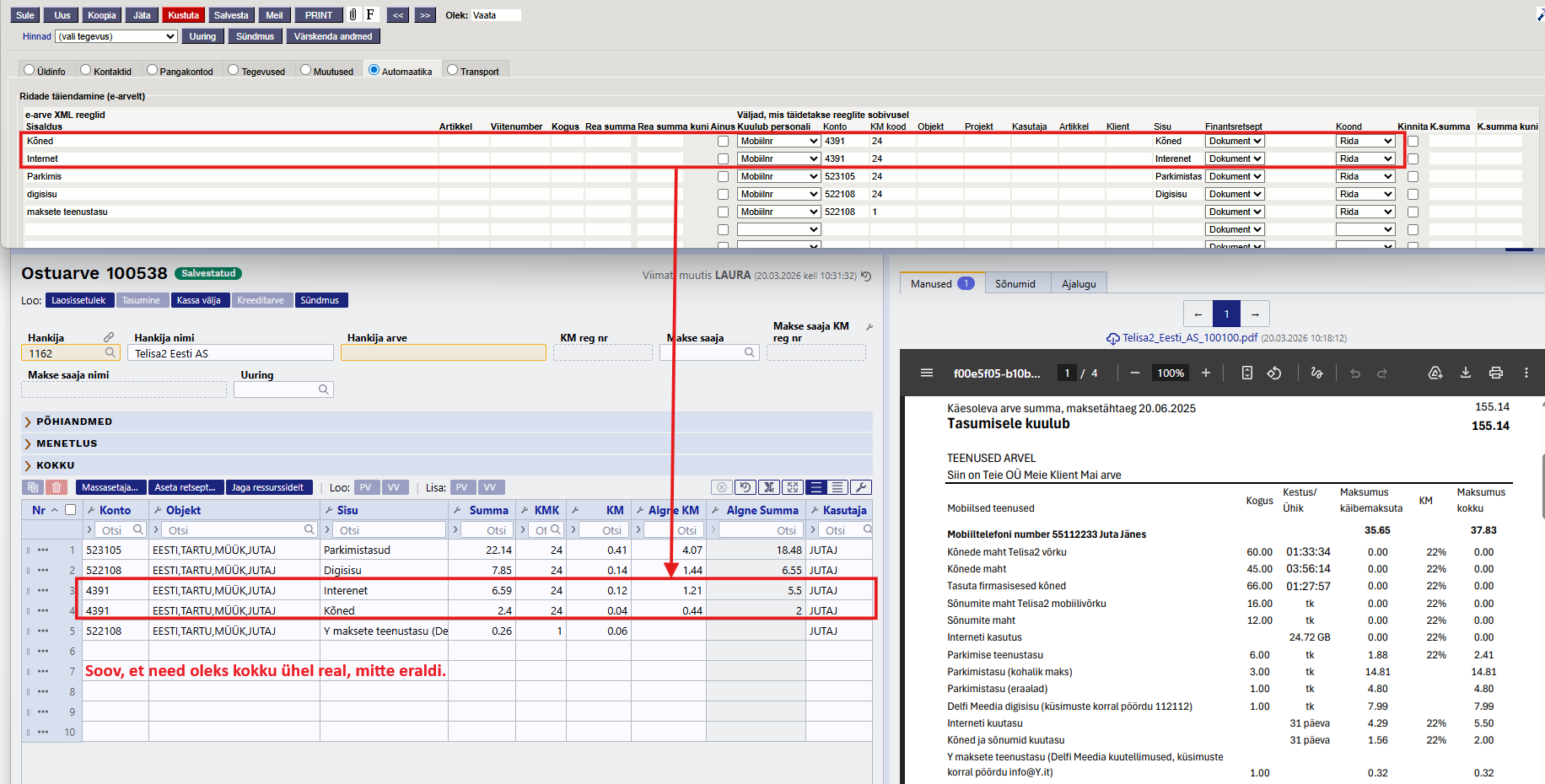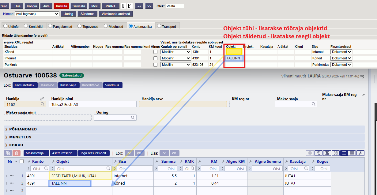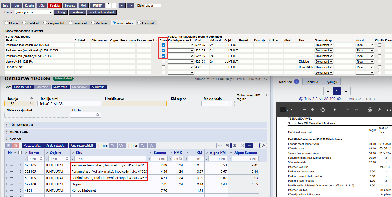 Näide: Telia andmesideteenuste arvel on igas mobiilinumbriga seotud teenusegrupis teenuse rida ‘Parkimise teenustasu’. Kui Mari mobiilinumber on 5123456, siis hankija automaatika reale tuleb kirjutada: Parkimise teenustasu%5123456 ja lisaks valid konto, objektid, projekti jms käsitsi.