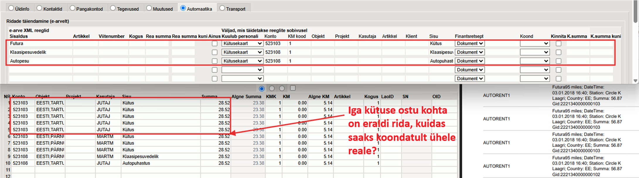 Näide: Kütusekaardiga on arve perioodi jooksul soetatud mitu korda „Futura“ kütust, ostuarvel kajastuvad mitmel real.