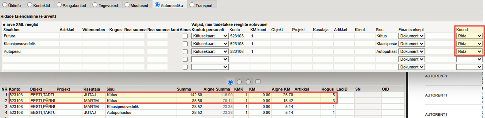 Näide. Kütusekaardi kulutused, kasutaja Juta kulud konteeritakse ostuarvel erinevale kontole. KMK, objekt ja rea sisu on jäetud tühjaks. Üldisest reeglist, mis kohaldub kõigi teiste töötajate kulutustele, lisatakse käibemaksukood ja objekt ka Juta kulutuste ridadele - kontot ei muudeta.