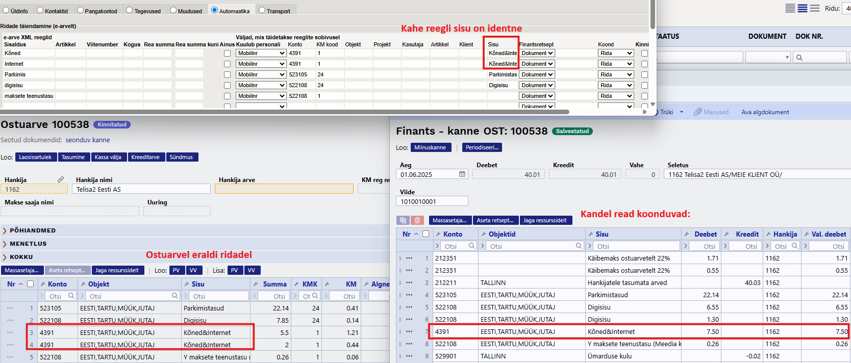 Ostuarvel erinevaid reegleid ühele reale koondada ei saa, kuid identsed read koonduvad kandel. Selleks veendu, et mõlema reegli konto, km, objektid jms on samad ning täida mõlema reegli Sisu identselt.
