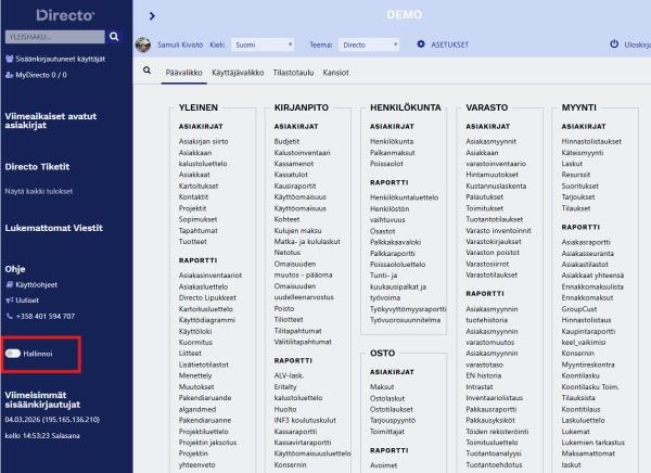 - Kirjanpito: Tilitapahtuma, Kassatoiminnot, Tiliote, E-lasku, Välitilipahtuma, Käyttöomaisuus-toiminnot, Inventaario