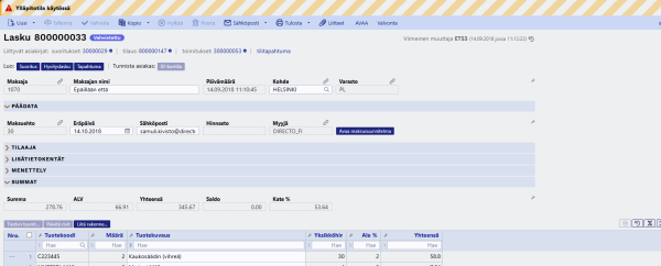 - Myynti: Tarjous, Tilaus, Varastotilaus, Lasku, Suoritus, Hinnasto