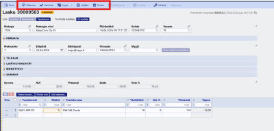 Uuden ulkoasun dokumenteissa on käytettävissä erittäin yksityiskohtainen muutosloki. Jokaisella tallennuksella lokiin lisätään kaikki tehdyt muutokset — sekä otsikon kentissä, lisävälilehdillä että rivitaulukossa.