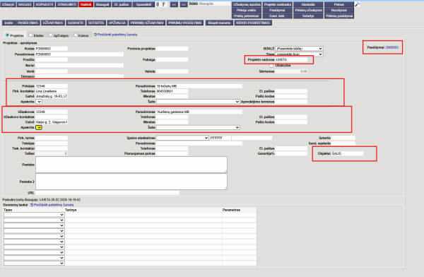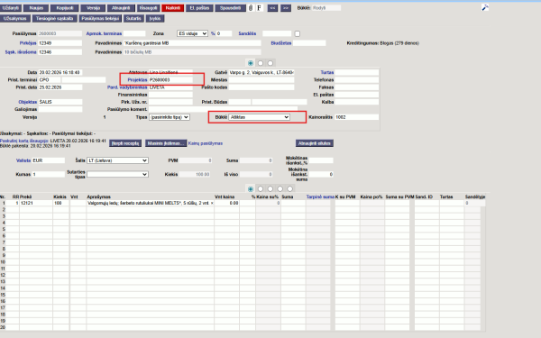 - Užsakymo laukas „Projektas“ nėra užpildytas.