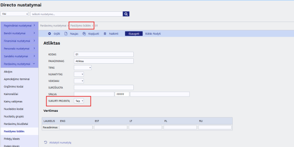 Svarbu: Tik būklėse, kuriose yra reikšmė „Sukurti projektą = TAIP“, tik su tokiomis būklėmis veiks automatinis projektų kūrimas.