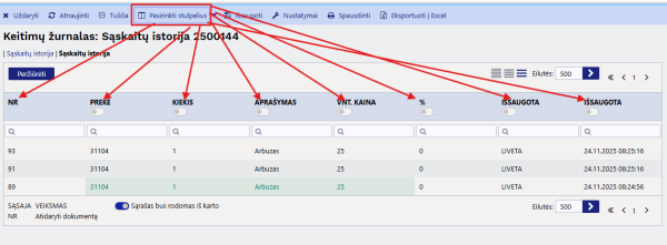 Yra galimybė pasirinkti laukelius pagal tai, kokia informacija mums yra aktuali ir ką keitimų žurnale norime matyti. Pasirinkti norimus stulpelius galime šioje vietoje: