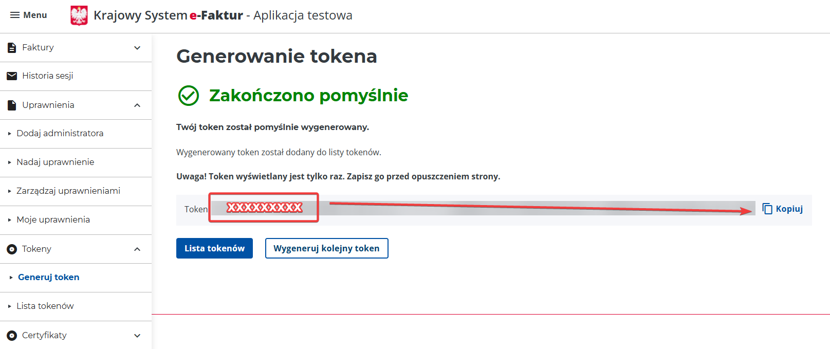 Attention! The token number is displayed only once. Please save it before leaving the page.