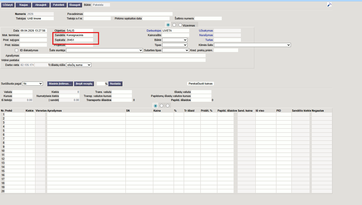 - laukelyje „sandėlis“ pasirenkate konsignacinis.
