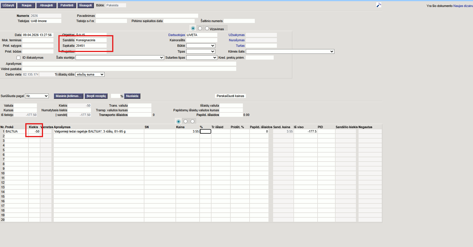 Su minuso ženklu vedamų prekių kaina turi sutapti su prekės priėmimo/pirkimo kaina, kitu atveju neleis patvirtinti dokumento.