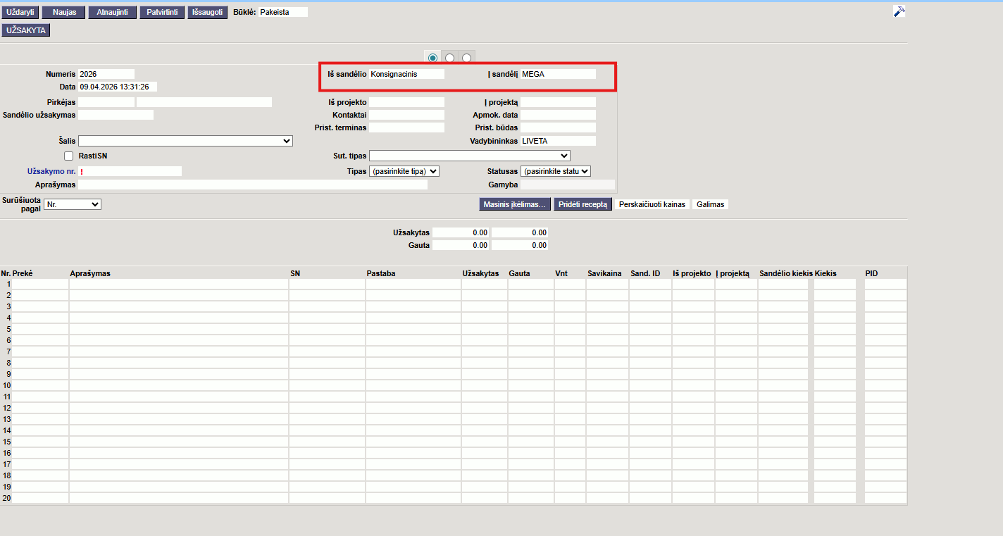 - Patvirtinus prekių priėmimą prekės nusirašys nuo sandėlio;