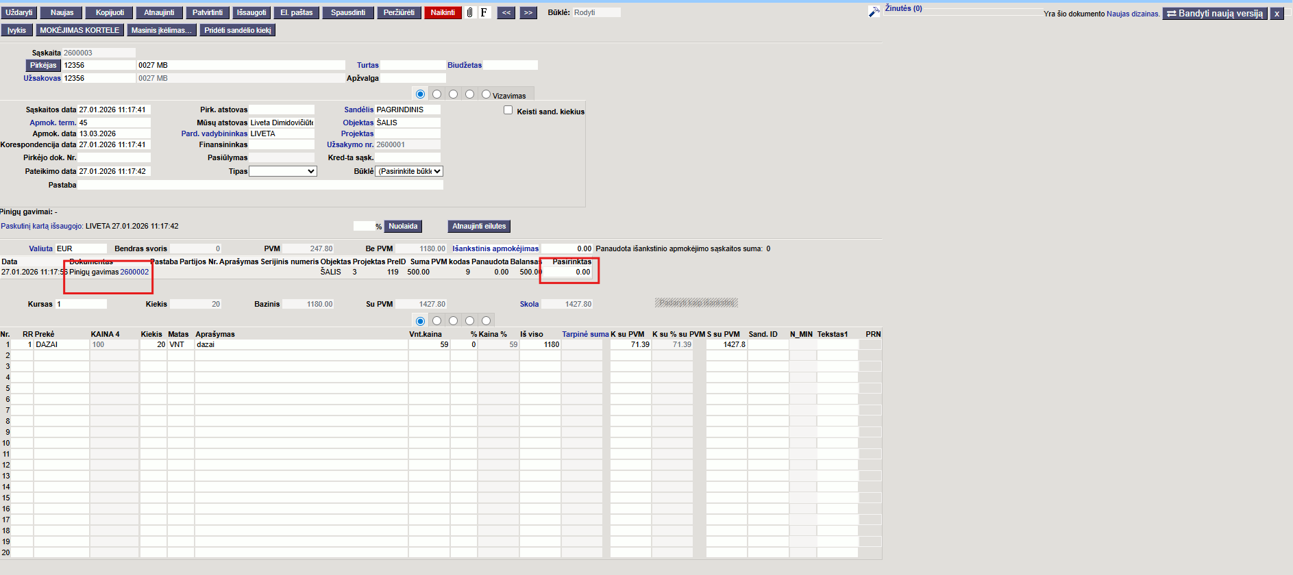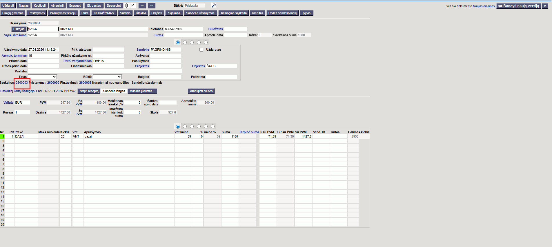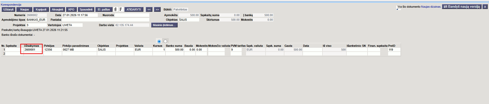 - Užsakymas – su dokumentu susijęs užsakymo numeris