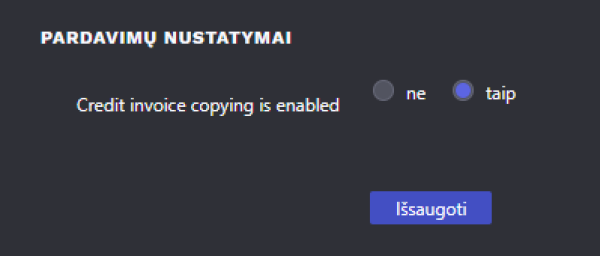 Norint kopijuoti jau patvirtintą kreditinę sąskaitą, pirmiausia reikia įjungti nustatymą, jį rasite Nustatymai → Pagrindiniai nustatymai → Administratoriaus nustatymai