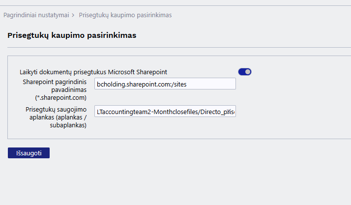 :?: Įsitikinkite, kad naudojamas Sharepoint puslapis yra pasiekiamas. Pavyzdžiui, jeigu imone.sharepoint.com yra nustatytas kaip Sharepoint pagrindinio puslapio pavadinimas ir directo_prisegtukai nustatytas kaip dokumentų bibliotekos pavadinimas, nuoroda imone.sharepoint.com/directo_prisegtukai turi būti veikianti ir atidaryti Sharepoint puslapį naršyklėje.