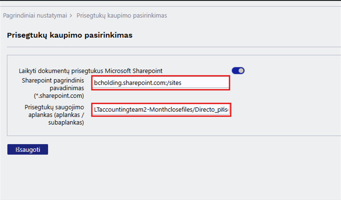 :!: Naudojant ne pagrindinį puslapį, pavyzdžiui imone.sharepoint.com/sites/Papildomas_puslapis ir biblioteką talpinimui Prisegtukai į nustatymų laukelius vesime tokią informacija: