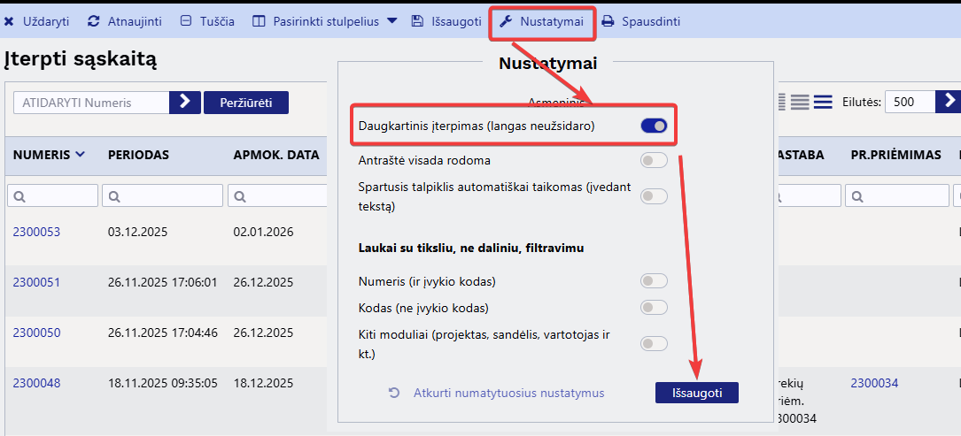 Parenkant dokumente inforamciją iš sąrašo, galime įsijungti nustatymą Daugkartinis įterpimas (langas neužsidaro) kuris neuždarys sąrašinio lango tačiau leis pasirinkti kelias reikšmes iš sąrašo, pvz. pardavimo sąskaitoje noriu pasirinkti kelias prekes iš sąrašo, apmokėjimo dokumente kelias pirkimo sąskaitas kurias noriu sudengti.