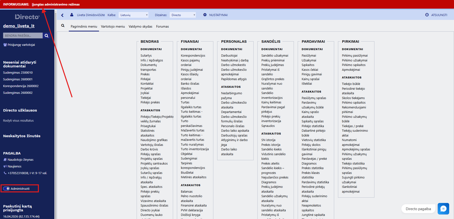 - Įjungus šį režimą, dokumentų antraštėse matysite pranešimą, kad esate administratoriaus režime.
