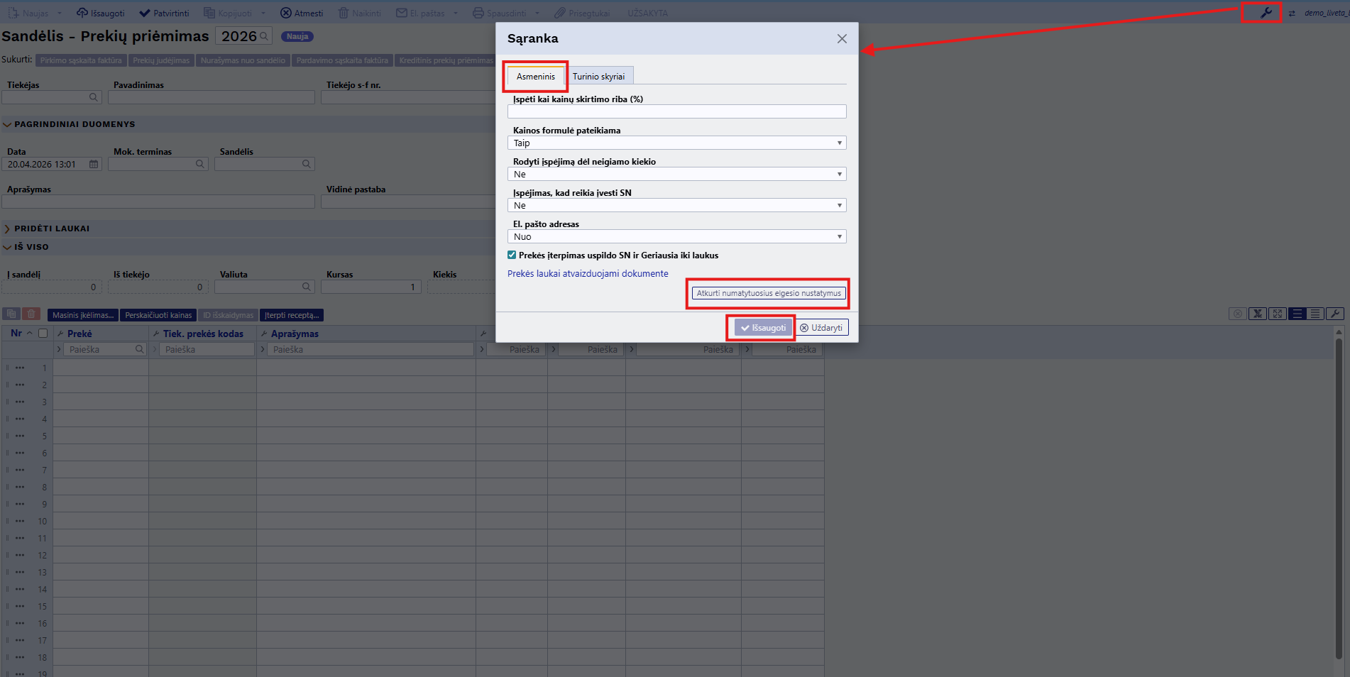 Parenkant dokumente informaciją iš sąrašo, galime įsijungti nustatymą Daugkartinis įterpimas (langas neužsidaro) kuris neuždarys sąrašinio lango tačiau leis pasirinkti kelias reikšmes iš sąrašo, pvz. pardavimo sąskaitoje noriu pasirinkti kelias prekes iš sąrašo, apmokėjimo dokumente kelias pirkimo sąskaitas kurias noriu sudengti. Tokiu atveju, Jums reikia: