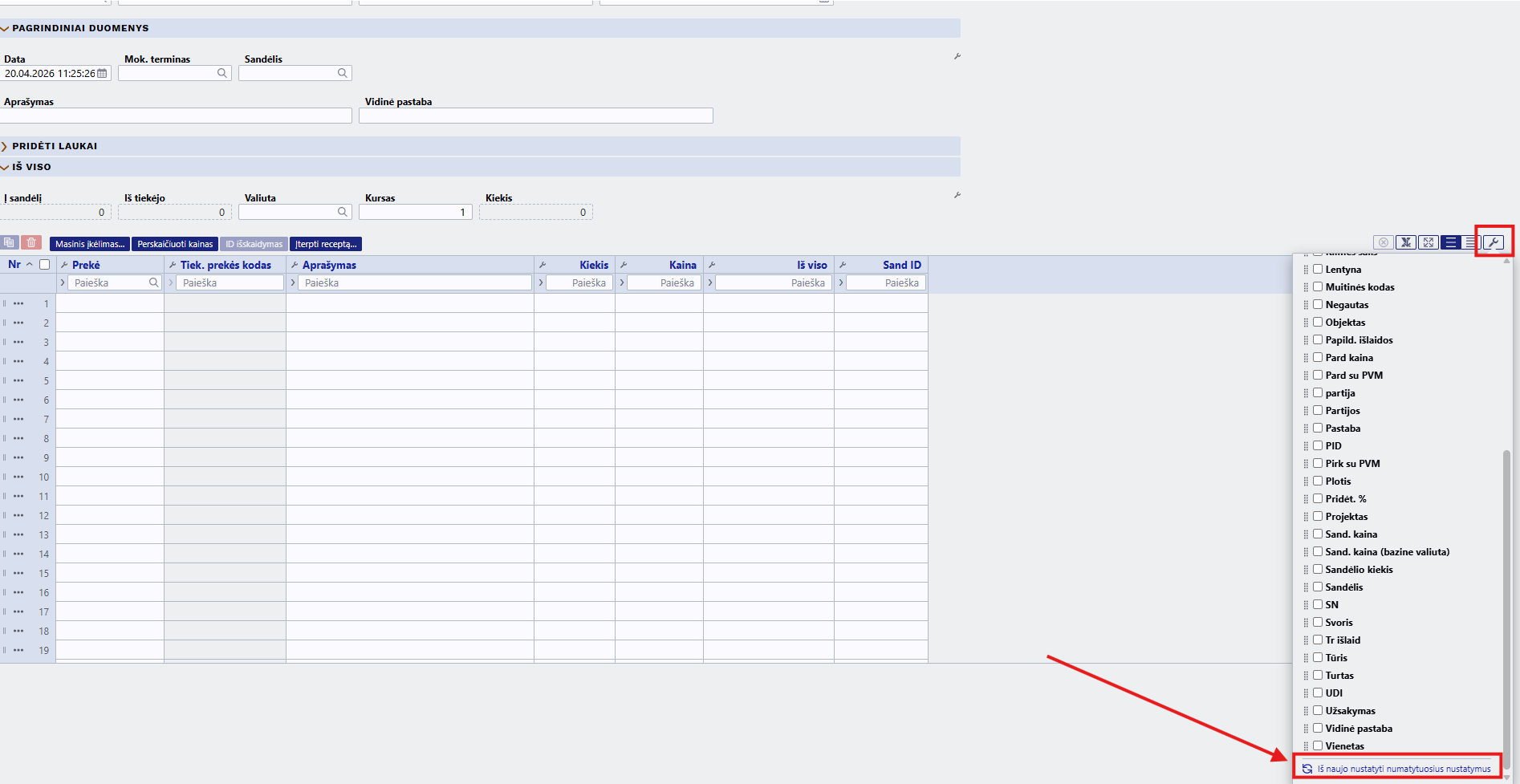 Tada reikia paspausti sąskaitos antraštėje esantį plaktuko ženklą pavadinimu „Puslapio nustatymai“. Jį paspaudus atsidarys langas, kuriame galėsime pažymėti, kurias skiltis norime matyti. Jeigu skiltį norime matyti - varnelę paliekame, jeigu skilties nenorime matyti - varnelę nuimame.