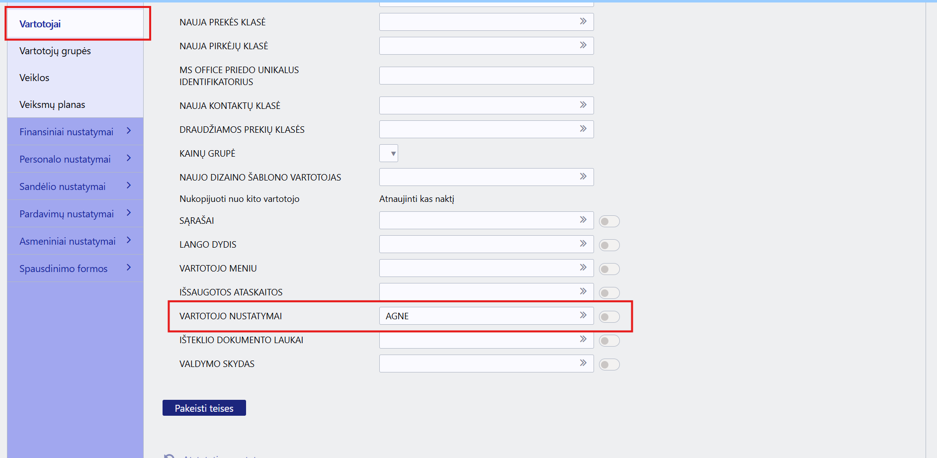 Kai tinkamas vartotojas yra sukonfigūruotas, jį galima nukopijuoti kitiems naudotojams per lauką VARTOTOJO NUSTATYMAI. Tai leidžia vartotojams, turintiems panašias roles, greitai pritaikyti vienodą dokumentų dizainą ir laukų išdėstymą.