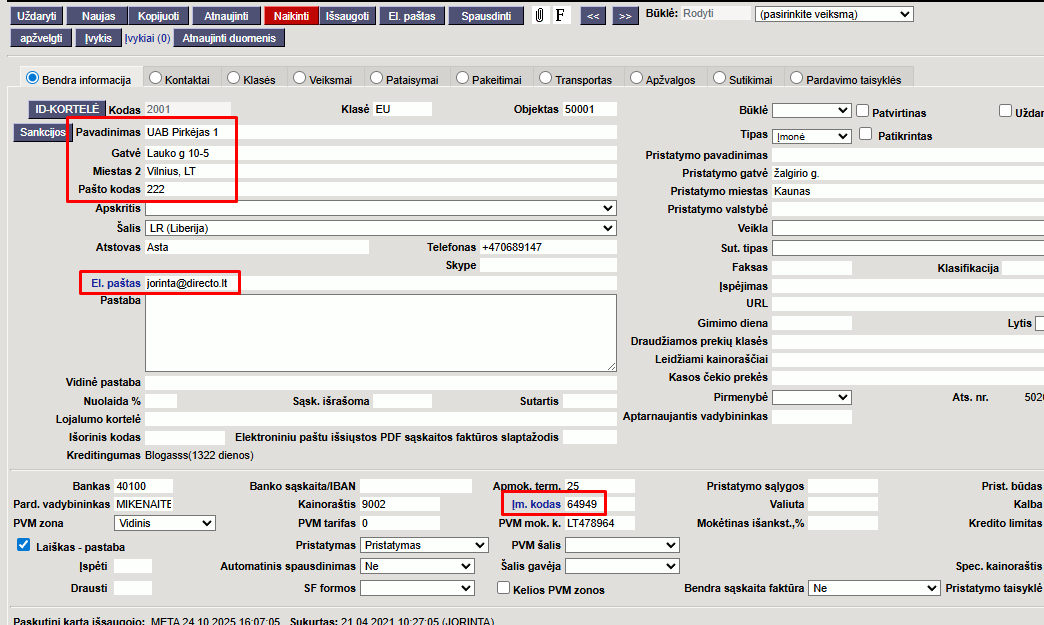Directo programoje adreso laukelis pirkėjo kortelėje gali būti nustatomas pagal vartotojų poreikį. Yra 3 galimos eilutės pirkėjo adresui. Juos galite arsti pagrindiniuose nustatymuose filtruojant žodį adresas