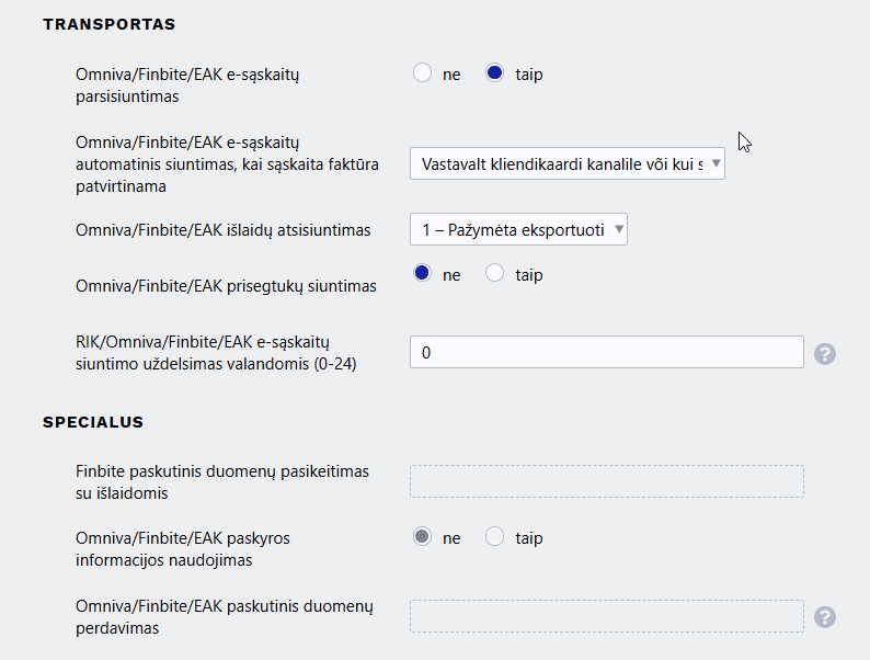 | Omniva/Finbite/EAK prisegtukų siuntimas | Ar prisegtukai yra siunčiami. Ne - siunčiamas tik pagrindinis sąskaitos prisegtuka, Taip - siunčiami visi sąskaitos prisegtukai |