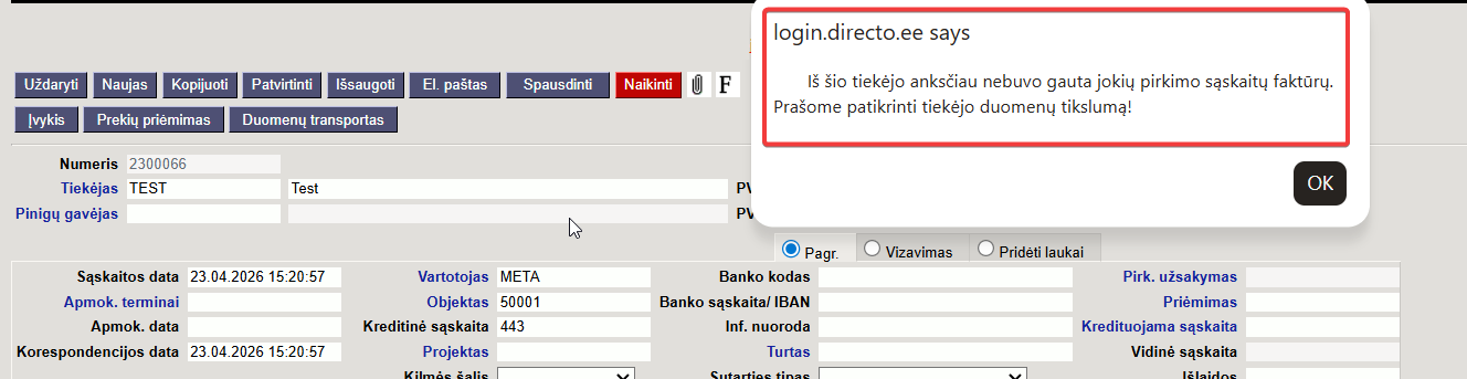 Kai iš naujo tiekėjo gaunama pirma pirkimo sąskaita yra galimybė kuriant sąskaitą gauti įspėjamąjį pranešimą, kad būtų patikrinamas tiekėjo informacijos tikslumas ar viskas suvesta teisingai.