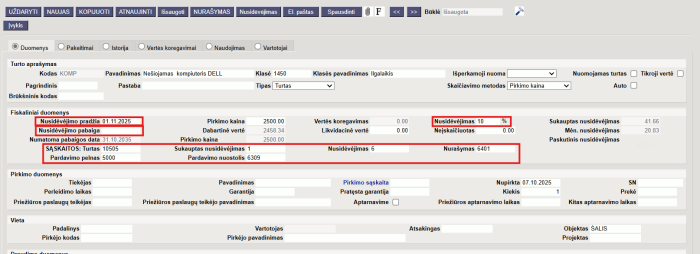 - Nusidėvėjimas - įvedamas procentas, kiek turtas turi būti nudėvimas per metus nuo pirkimo kainos;