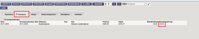 Norint rasti korespondenciją kuri buvo sukurta atliekant nurašymą, reikia pasirinkti turo kortelę ir joje spausti burbuliuką „Pakeitimai“.