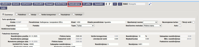 Taip pat, skiltyje DUOMENYS pasikeiskite nusidėvėjimo procentą bei nusidėvėjimo pabaigos datą.
