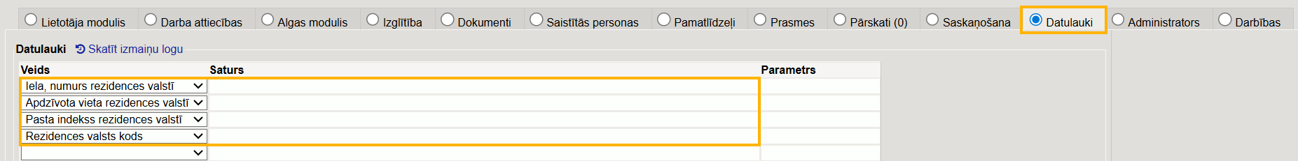 Kad ir izveidoti datulauki nerezidentu adrešu norādīšanai, tad nerezidentu darbinieku kartīšu (sistēmas galvenais logs → kolonna PERSONĀLS → DOKUMENTI → Personāls) sadaļā Datulauki ir jānorāda viņu adreses.