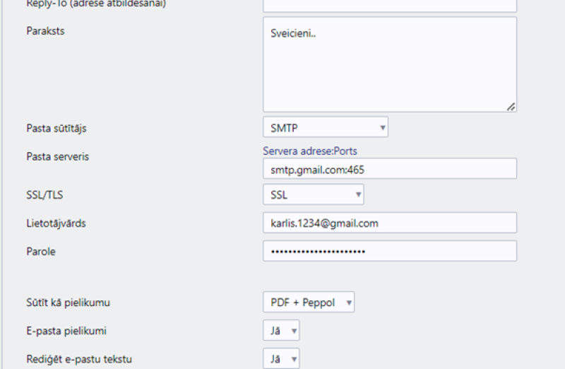 Ir situācijas (piemēram, ja uzņēmumam ir savs pasta serveris), kad ir nepieciešams iestatīt vienādu konfigurāciju visiem lietotājiem e-pastu sūtīšanai. Lai to izdarītu, ir iespējams konfigurēt iestatījumus vienam lietotājam un pēc tam iestatīt šī lietotāja kodu kā Sistēmas kodu: “Pasta sūtīšanas lietotāja kods — šī lietotāja SMTP konfigurācija ir pamats e-pastu sūtīšanai”.