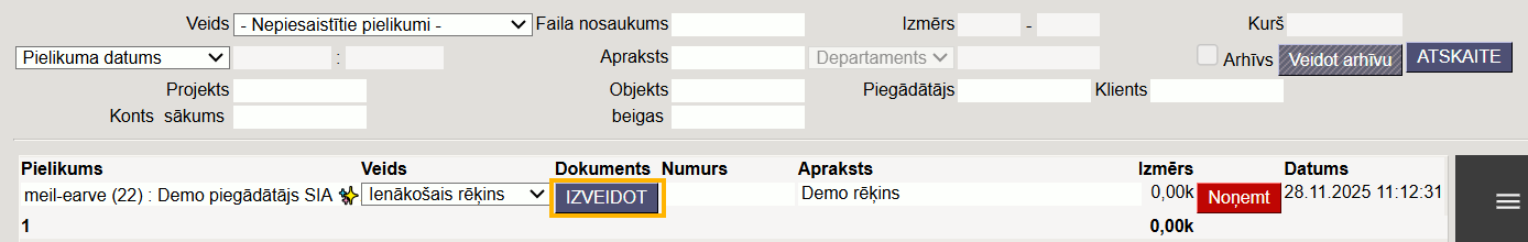 Tad tiks parādīts saraksts ar visiem pielikumiem, kuri ir datubāzē, bet kuri nav piesaistīti nevienam dokumentam vai kartītei.