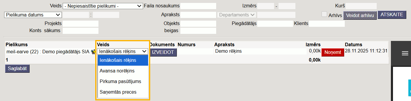 Pie konkrētā pielikuma kolonnā Veids jānorāda dokumenta veids, kurš jāreģistrē no konkrētā pielikuma: ienākošais rēķins, avansa norēķins, pirkuma pasūtījums vai dokuments Saņemtās preces.