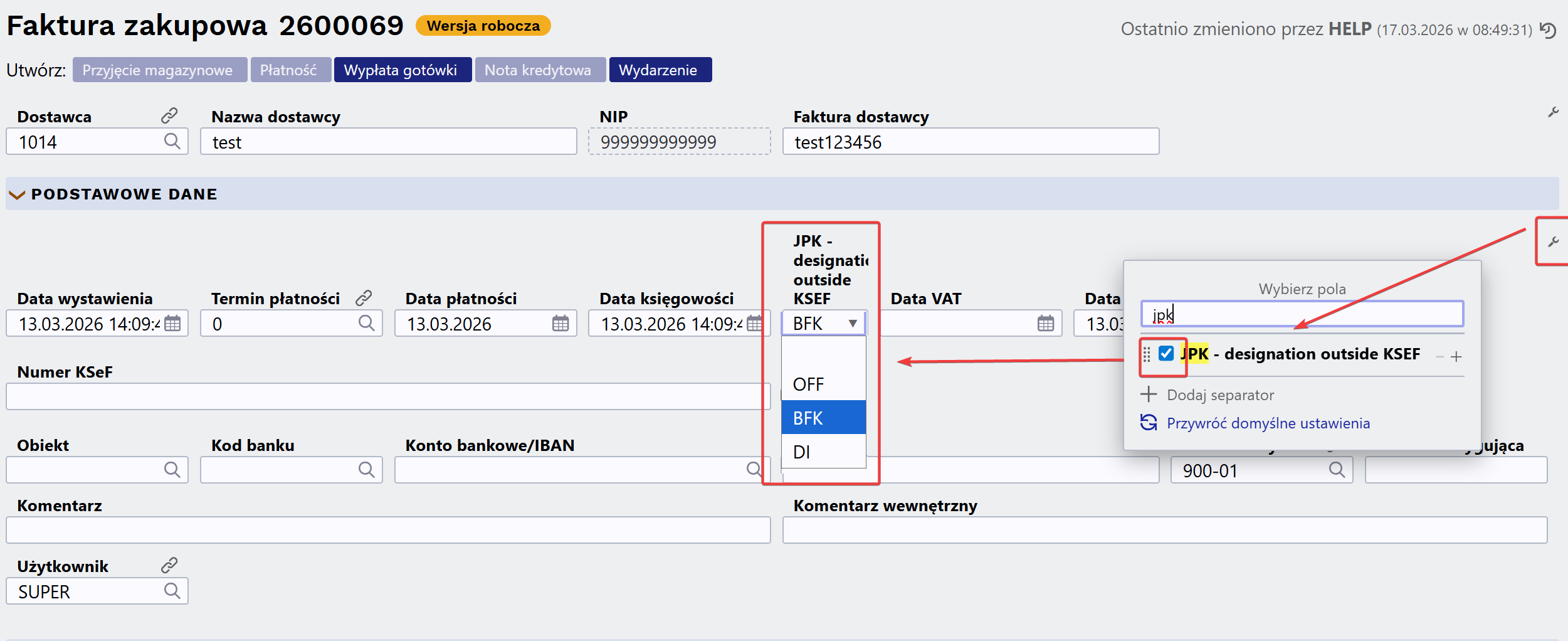 - JPK - designation outside KSEF - należy wybrać jedną z opcji, jeżeli dana faktura nie posiada numerek KSEF: