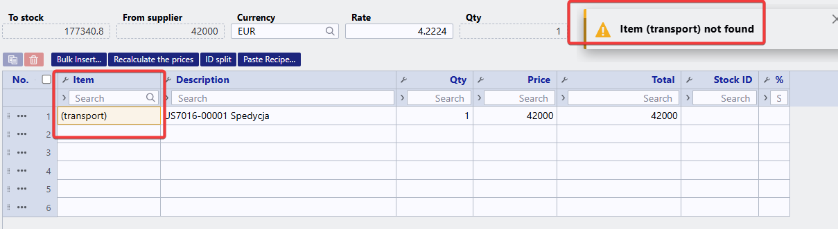 If Directo didn't found item code you will see text in item code field: (transport) and an error message: