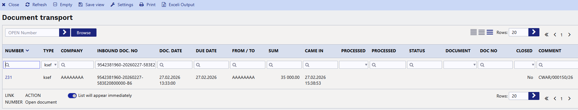 After the invoices are downloaded from KSEF, Directo creates a document Document transport with the tipe ksef (Main meniu→Common→Documents→Document transport).