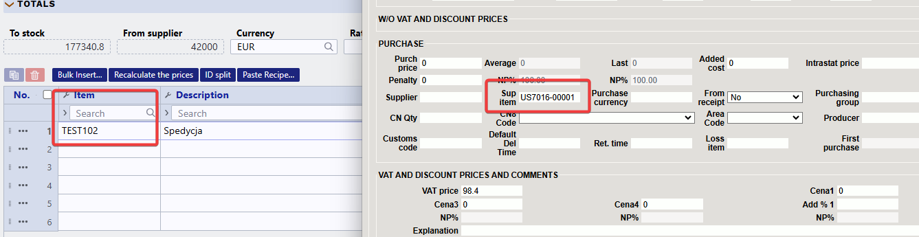 If the supplier item code was added to item card field Sup item - while creating stock recipe document Directo will add correct Directo item code to the rows.