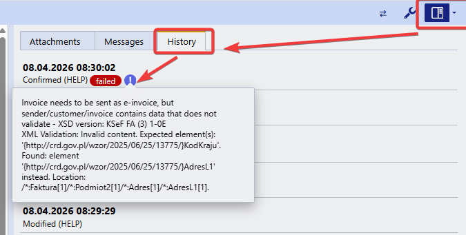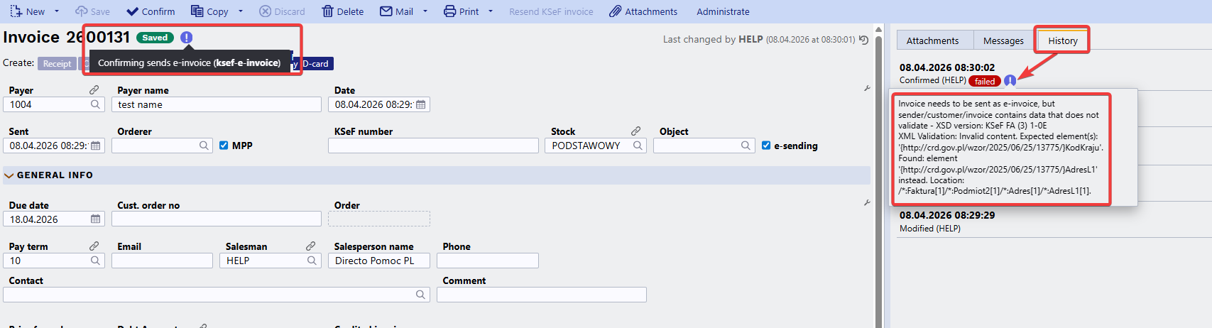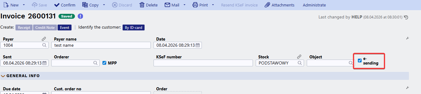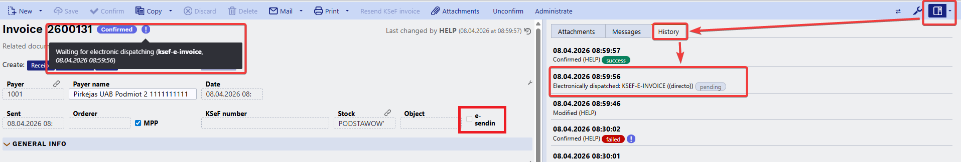 After confirm the invoice there will be mark: Waiting for electronic dispatching (ksef-e-invoice 08.04.2025 08:59:56 and checkbox e-sending will not be marked.