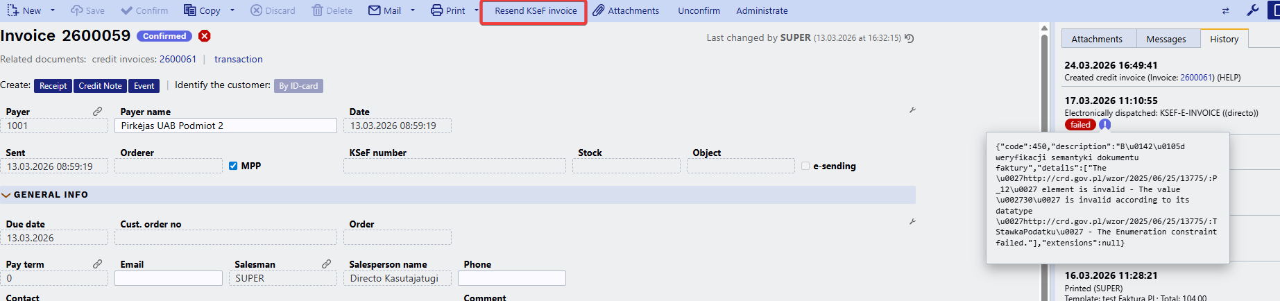 While confirming of the invoice, Directo checks if the settings are filled correctly. If there is something incorrect - there is no possibility to confirm the invoice with checkbox e-sending. You may confirm invoice with out the checkbox e-sending - it will not be send to KSEF.