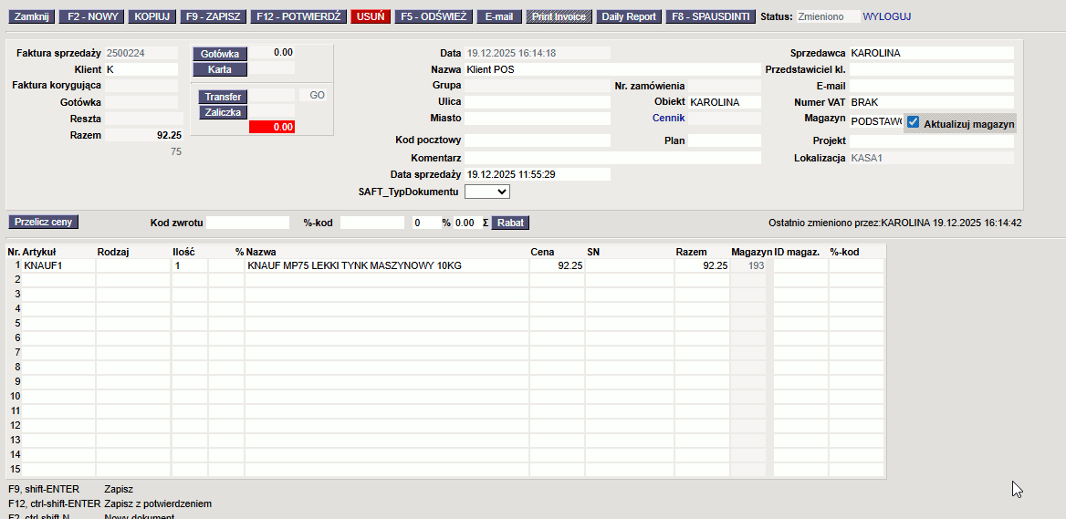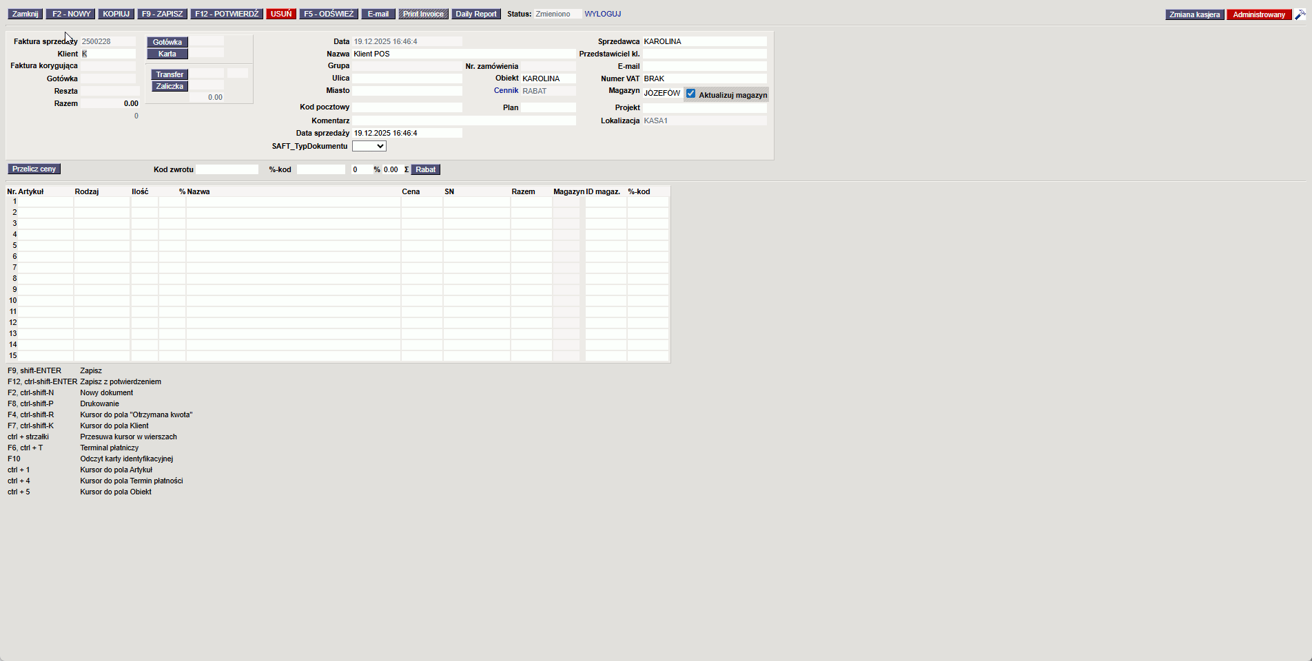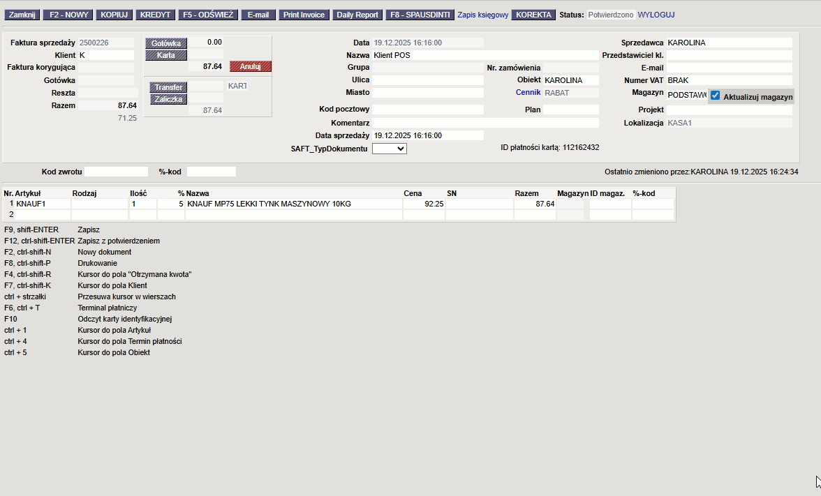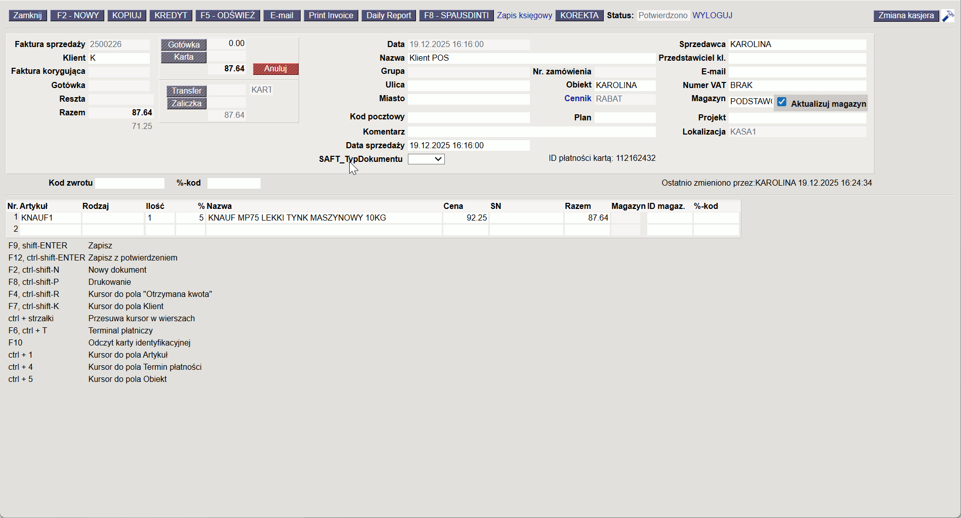 - Potwierdź – zatwierdza dokument i drukuje paragon (F12).