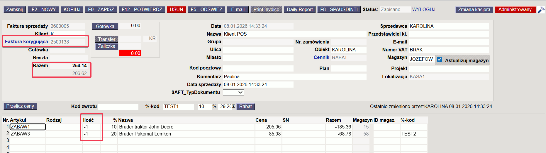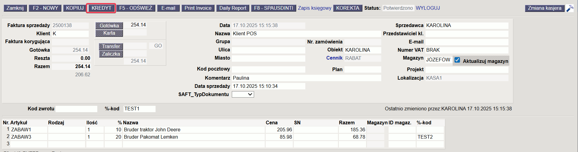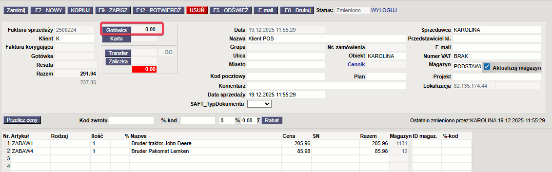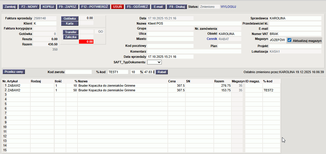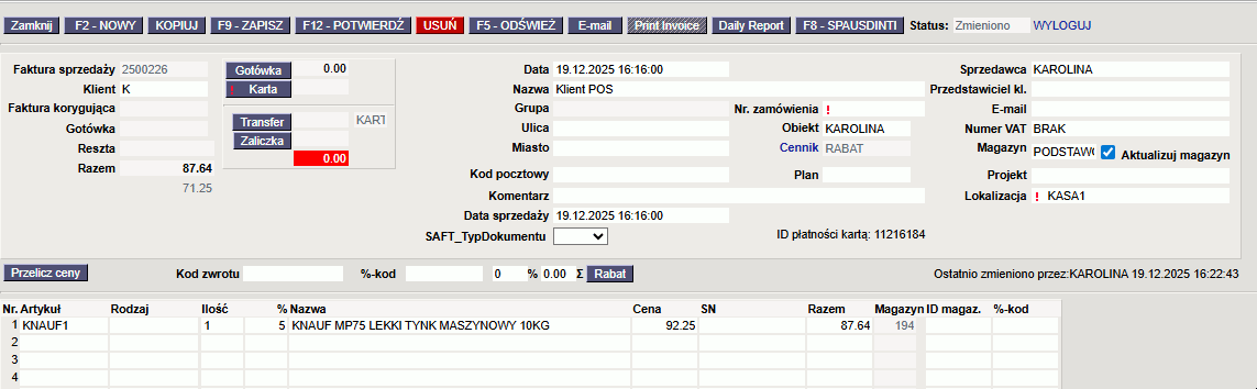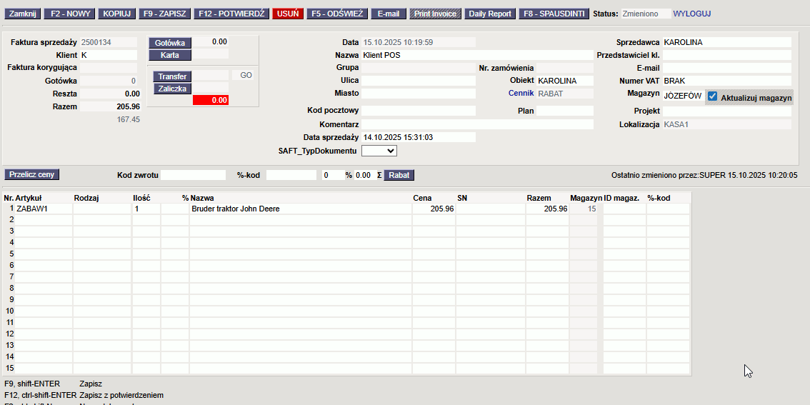- Potwierdź – zatwierdza dokument i drukuje paragon (F12).