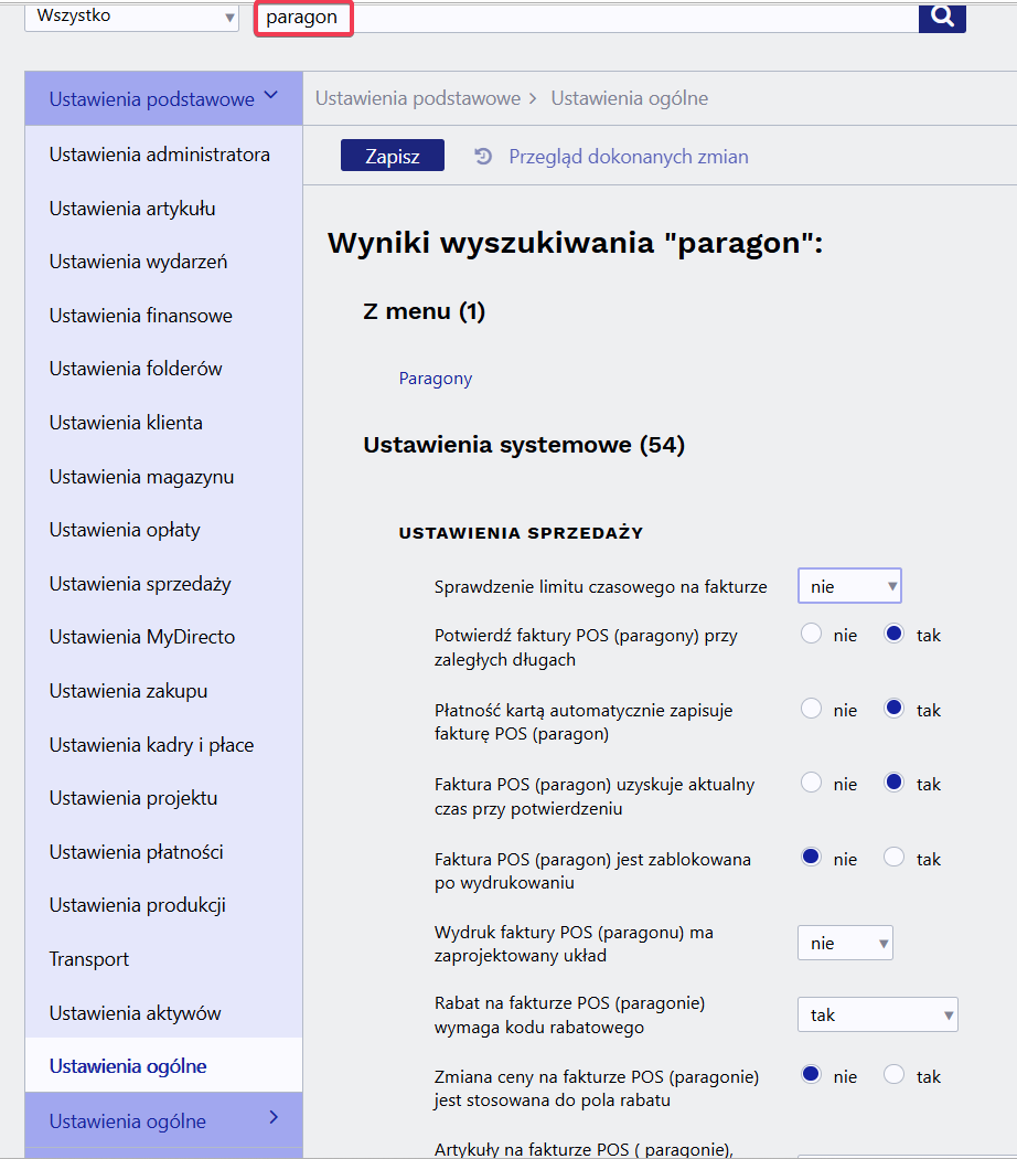 Aby zobaczyć wszystkie dostępne ustawienia związane z paragonami, wpisz w wyszukiwarkę słowo Paragon - system wyświetli pełną listę opcji.