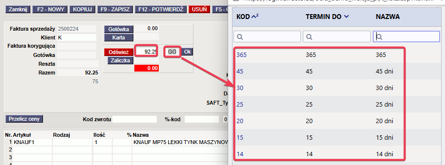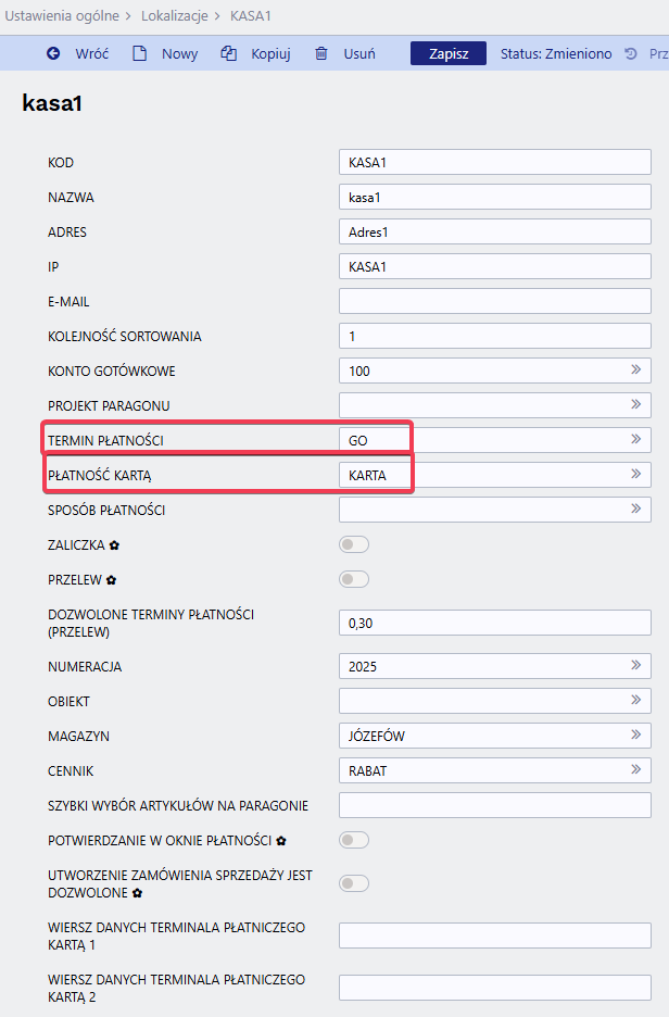 - Płatność kartą - uzupełniamy termin płatności utworzony dla kart (typ karta)