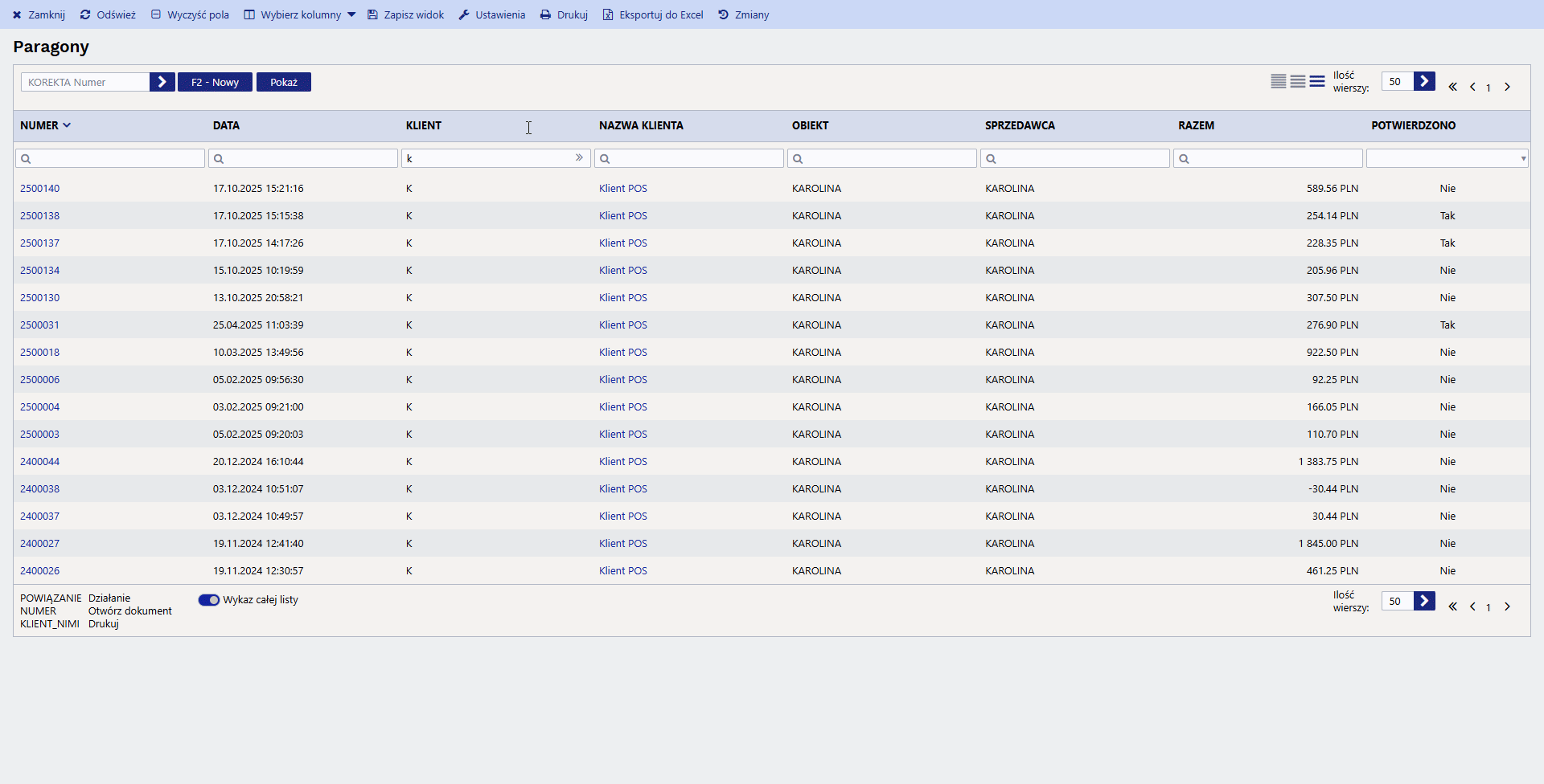 Paragony gotówkowe znajdują się również w rejestrze „Faktury”, gdzie można je wyszukiwać, przeglądać i edytować.