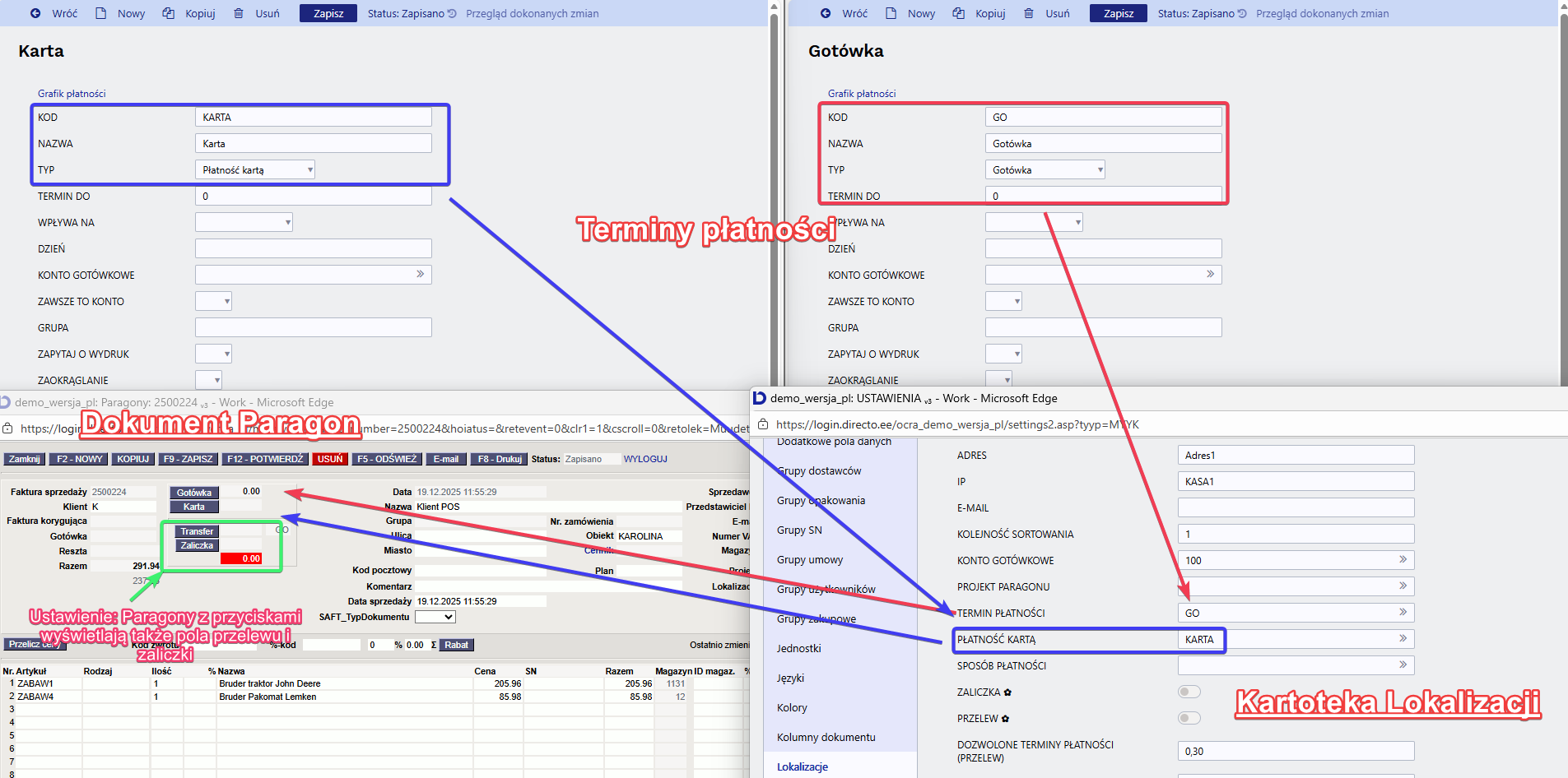 Aby na paragonie dostępne były płatności gotówką i kartą, w ustawieniach należy wybrać opcję Multi + Wspólny jako typ terminu płatności.