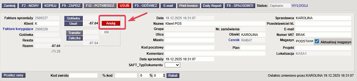 - Naciśnij przycisk GOTÓWKA lub klawisz F4.