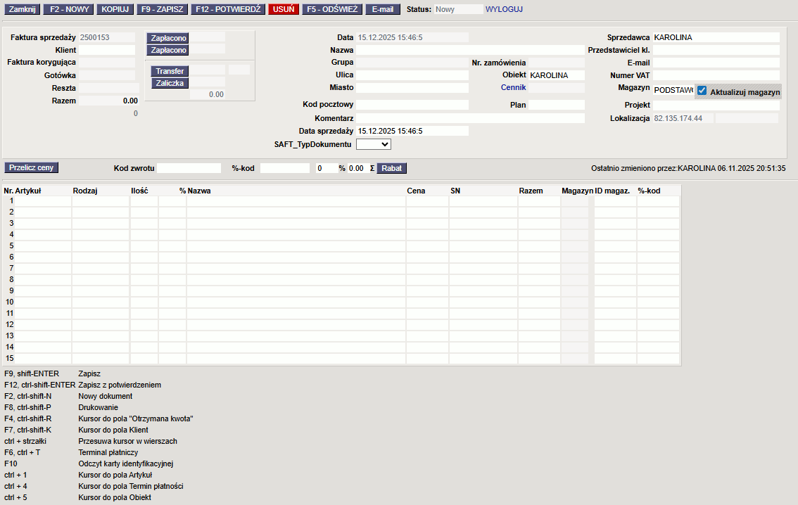 - Dwuklik w polu „Klient” → wyszukaj w rejestrze klientów lub utworzyć nowego kontrahenta