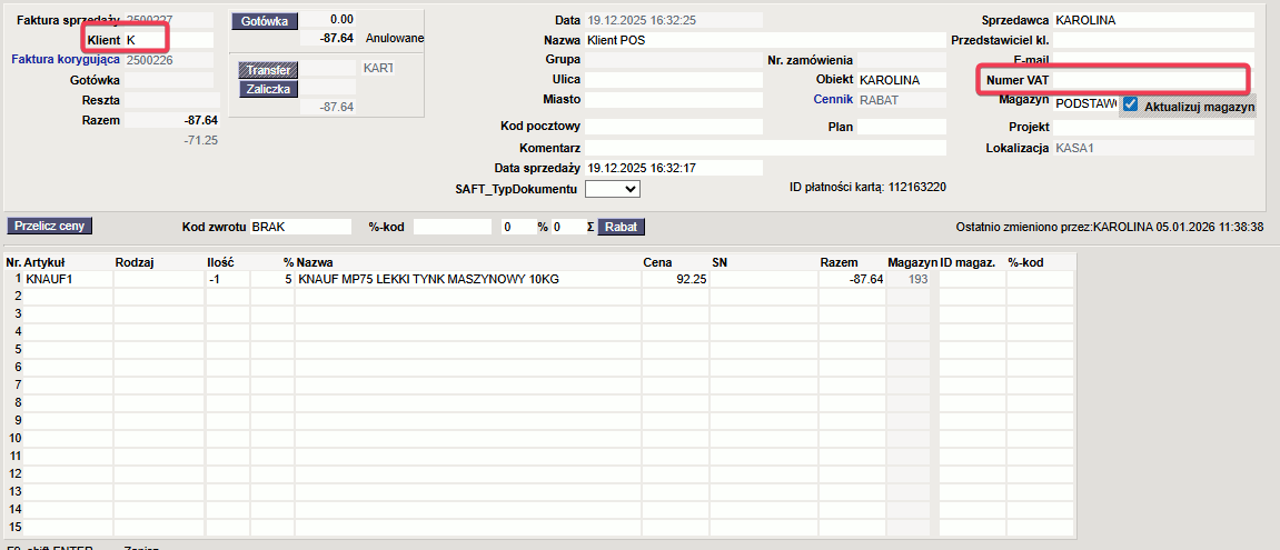 - Klient – kod klienta (automatyczne uzupełnienie danych z karty klienta).