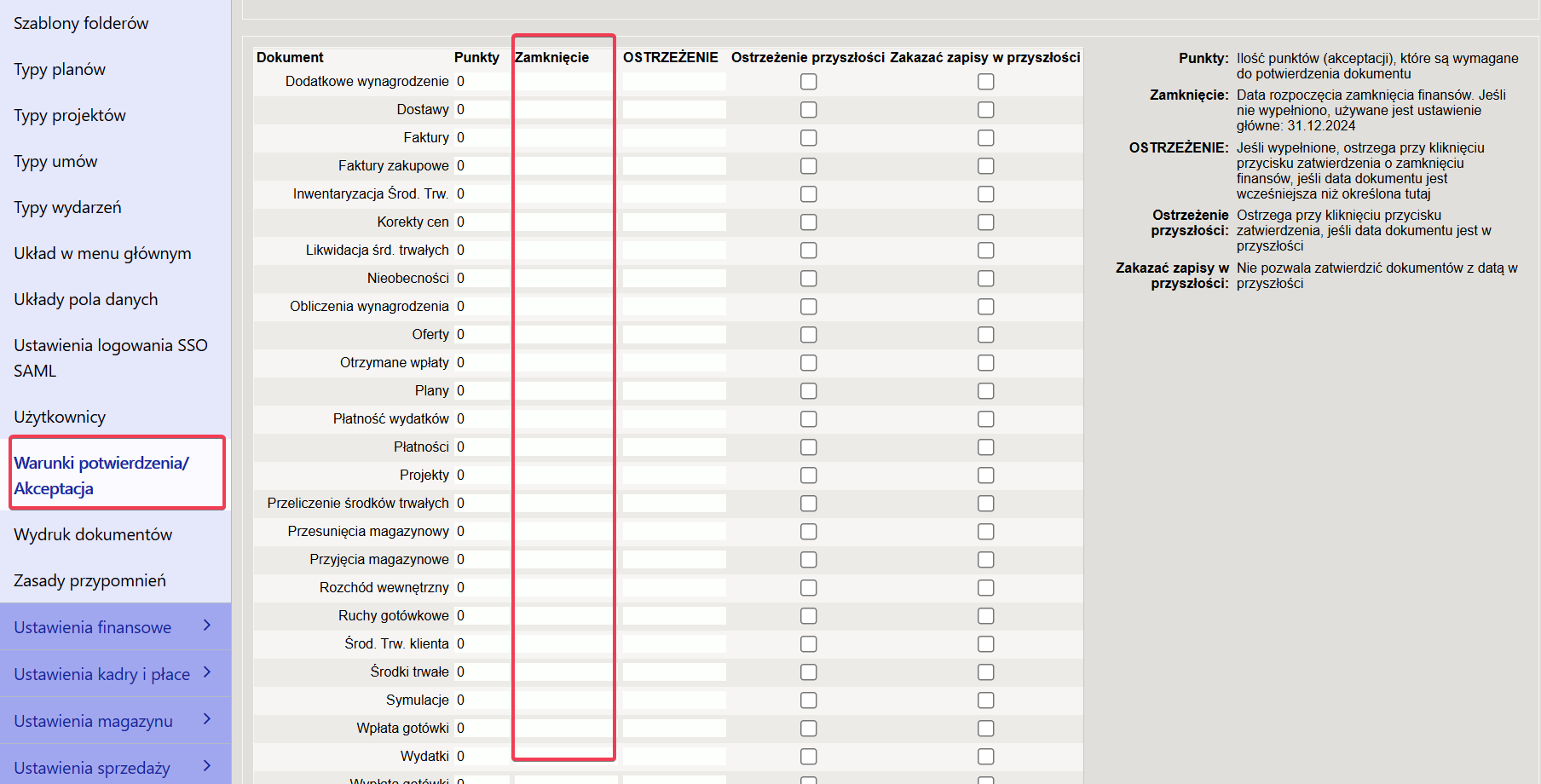 Ustawienia –> Ustawienia ogólne –> Warunki potwierdzenia/ Akceptacja