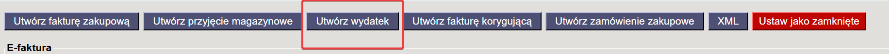 Utwórz wydatek –Tworzy dokument wydatków na podstawie e‑faktury. Proces przebiega analogicznie jak w tworzeniu faktury zakupu.